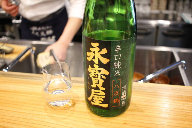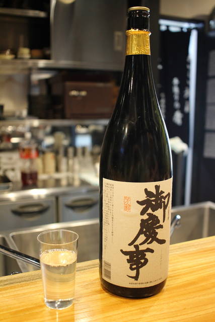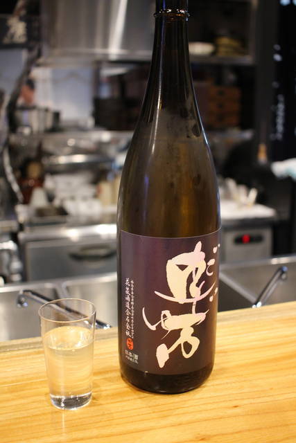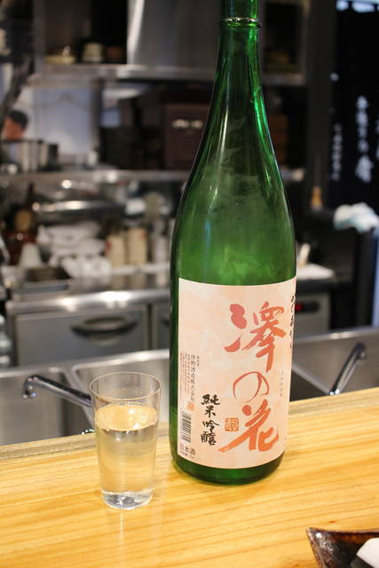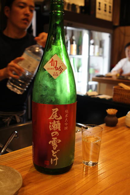 注文した日本酒の一升瓶を必ず置いていってくれるんだよ。素晴らしいでしょ。お酒の情報を読んだりラベルを眺めることができるし、我々のように写真を記録に残すのにも重宝する。空瓶ではないから重くて相当面倒くさいだろうと思うが、そういう演出はやはり有るのと無いのとでは楽しさも全然違う