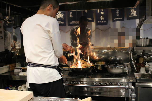 一人分のカツオを藁でファイヤーしている。味のためでも有るが良い演出だ