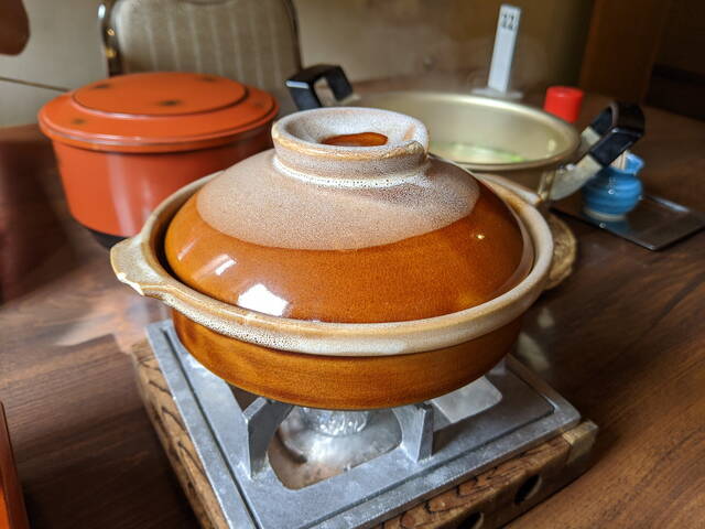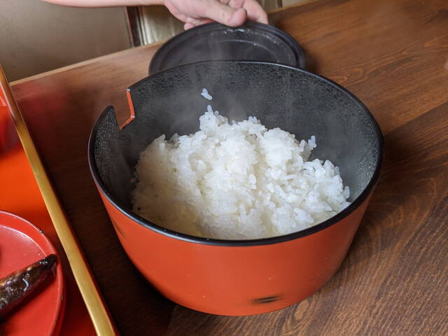 駒の湯では大きい椀が米、小さい椀が汁物と配膳されているがどうしても馴染めなく、逆に盛り付けている