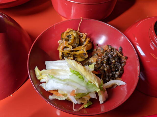 朱塗りの器に盛られた上質なおかずたち、美しい内容の朝食だと思う