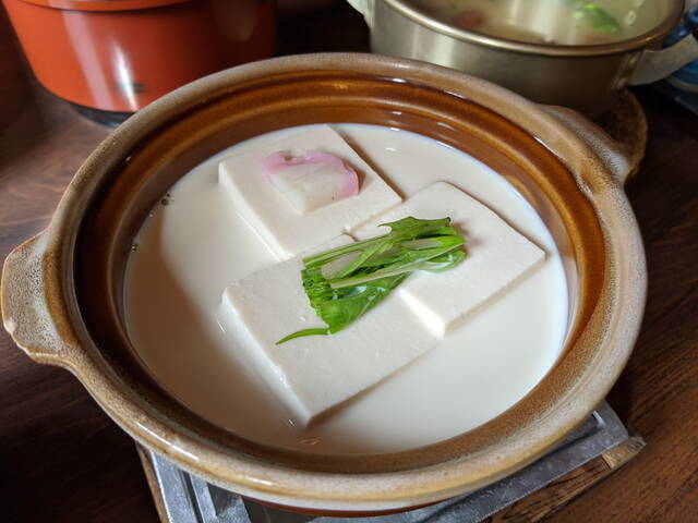 固形燃料が消える頃、湯葉ができる。豆腐は温まりとても柔らかい