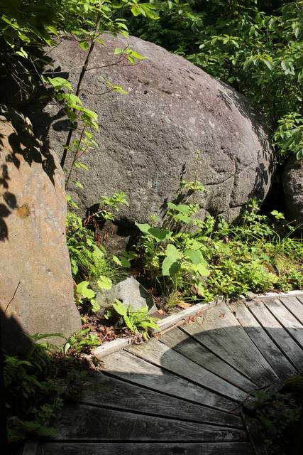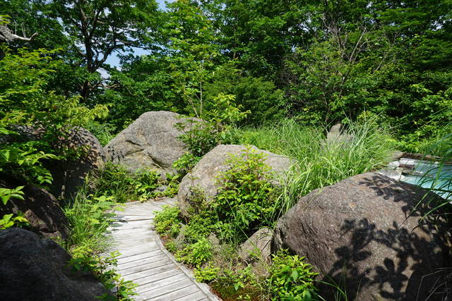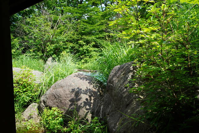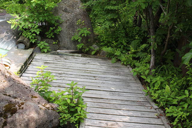 目の前には岩が。すぐ露天風呂が見えるのかと思ってた