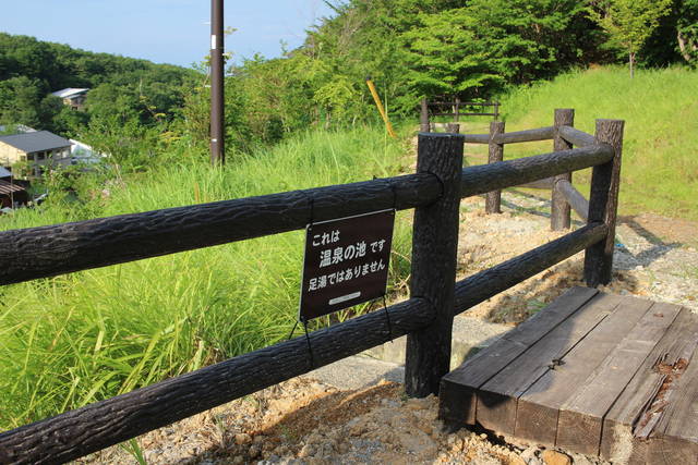 どうみても足湯なのに「これは温泉の池です足湯ではありません」と書かれたら利用者も困るよ。その下にはテプラで小さく「自由にご利用下さい」と書いてある。