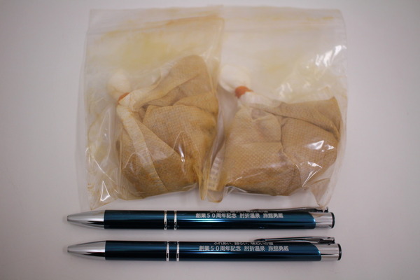 チェックアウト時に予約特典の湯の花とボールペンを頂く。IMG_2182